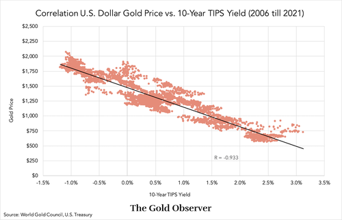 “Causality between gold and the TIPS yield is hard to prove, butthe correlation is very strong (correlation coefficient -0.933) and there is a “rational” narrative.“